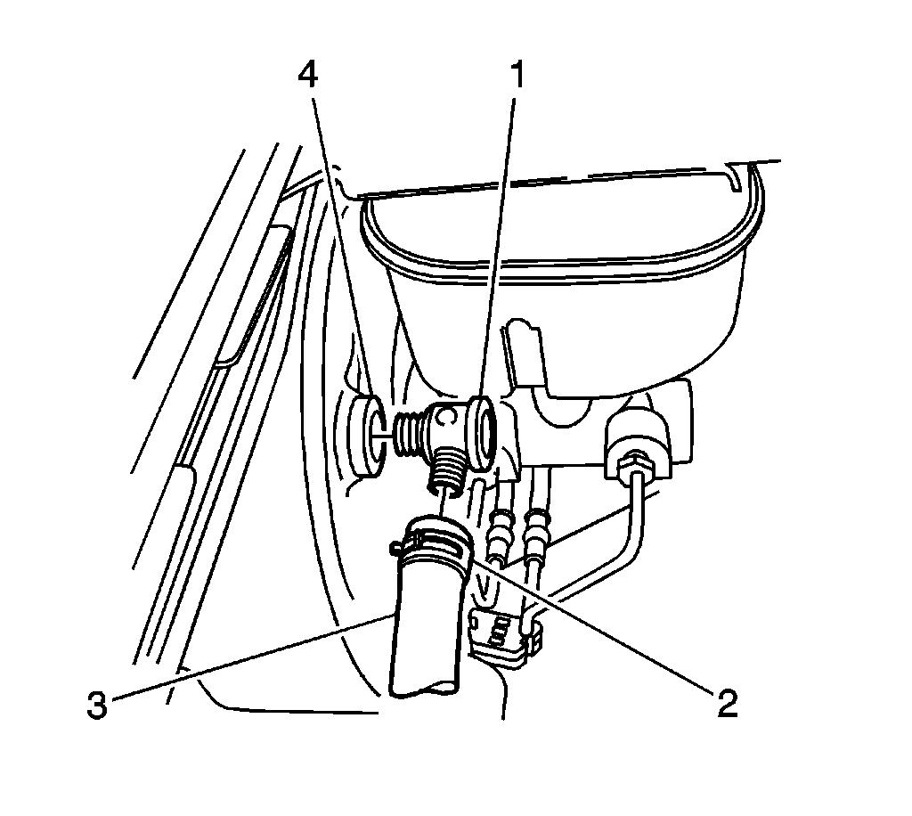 1. Deplete the vacuum from the vacuum brake booster by removing the vacuum check valve (1) from the vacuum brake booster grommet (4). Do not disconnect the vacuum check valve (1) from the vacuum brake hose (3).