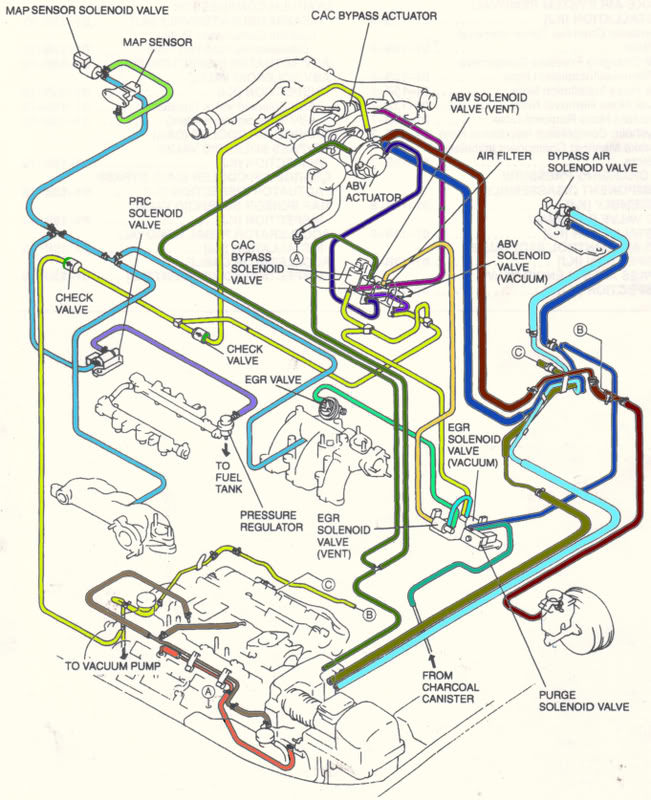 The lines leading from the supercharger to the crankcase are a bit more complicated on the 95. There's an additional solenoid and line leading back to the intake, but otherwise the vacuum diagram is relatively similar.