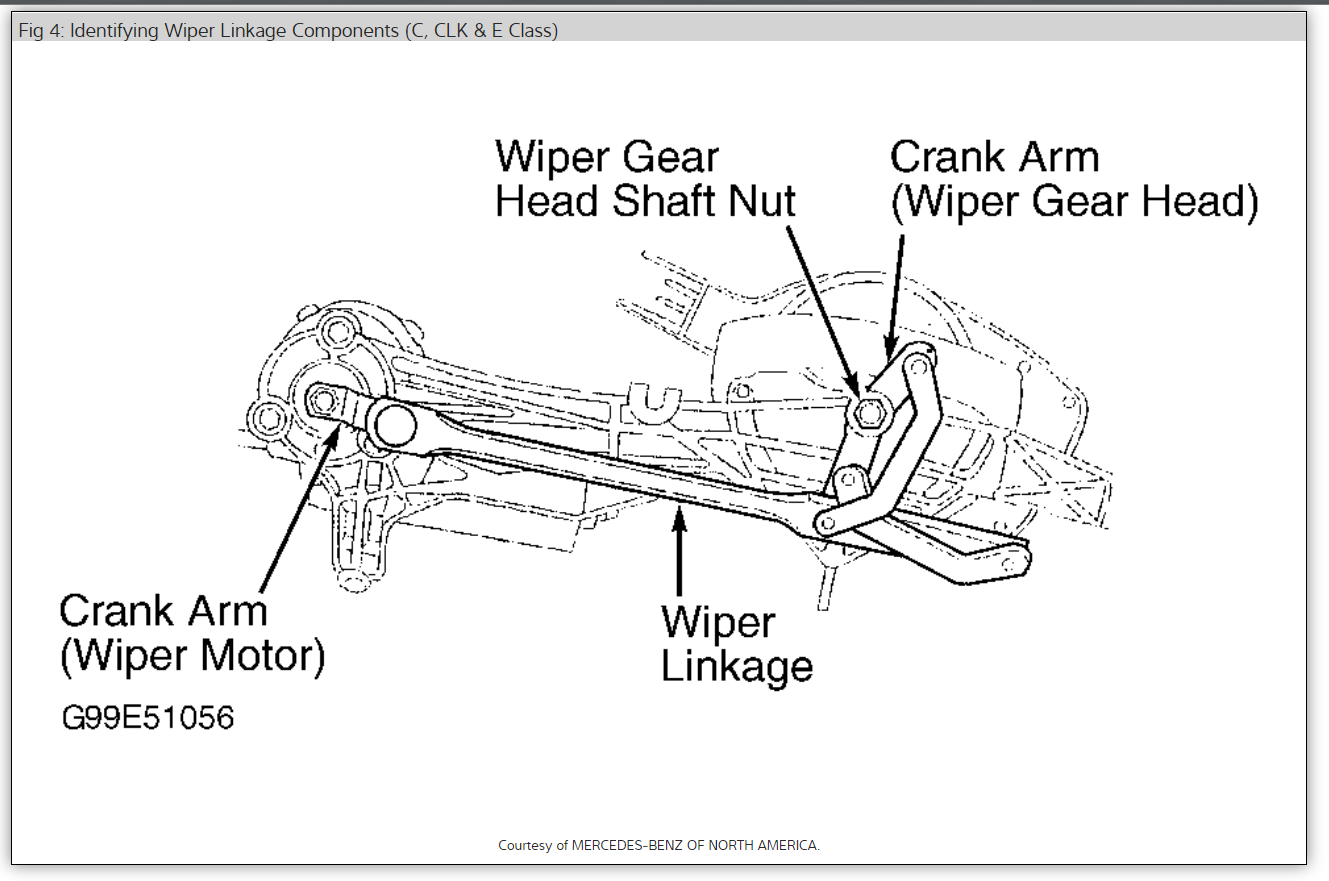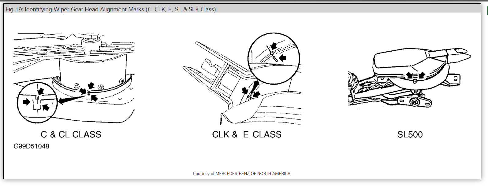 I'm replacing the wiper transmission on my 1999 C230K. I've purchased a used transmission and have a new motor. I think that there must be a procedure for making sure the wiper is correctly aligned (synchronized with the motor) disassembly/reassembly. Can you provide this or the entire procedure for replacing the wiper transmission? Thanks!