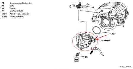 Now back to the problem. It's unfortunate that there are a lot of poeple just trying to make a buck but throwing parts at a car solves nothing most of the time, just empty's your wallet. Throwing a throttle body at it may work but if it doesn't your out another grand. Here's what I would try first. Below is a diagram. The circled image is your throttle body. The arrow is pointing to the connector at the throttle body. Now this image is reversed so the throttle body will actually be at the back of the motor. Find the connector I've draw the arrow to.