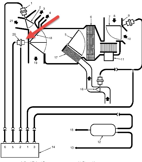You will see the blower motor resistor (1) just below the vent hose. The arrow is pointing at the blower motor housing.