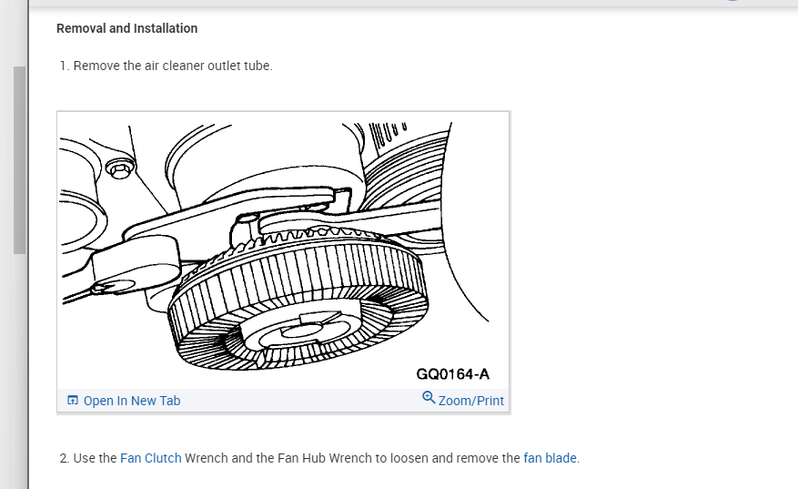 The manual does not have a lot of detail so please review the guide above. However, below you will find the info from the manual that will show where to put a 3/8 ratchet and holding tool to hold fan in place while you are removing the nut.