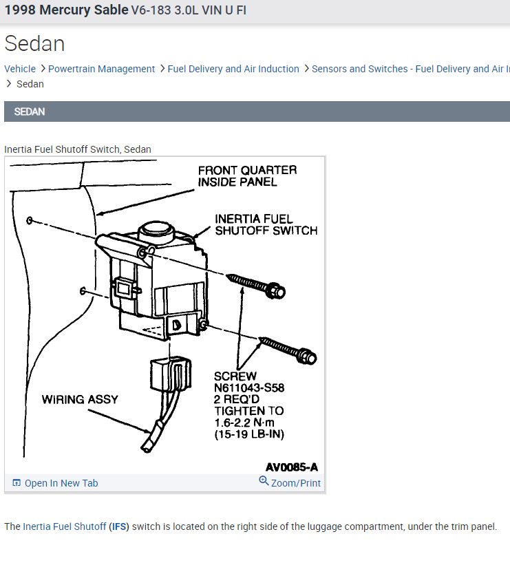 The Inertia Fuel Shutoff (IFS) switch is located on the right side of the luggage compartment, under the trim panel (see diagram below)