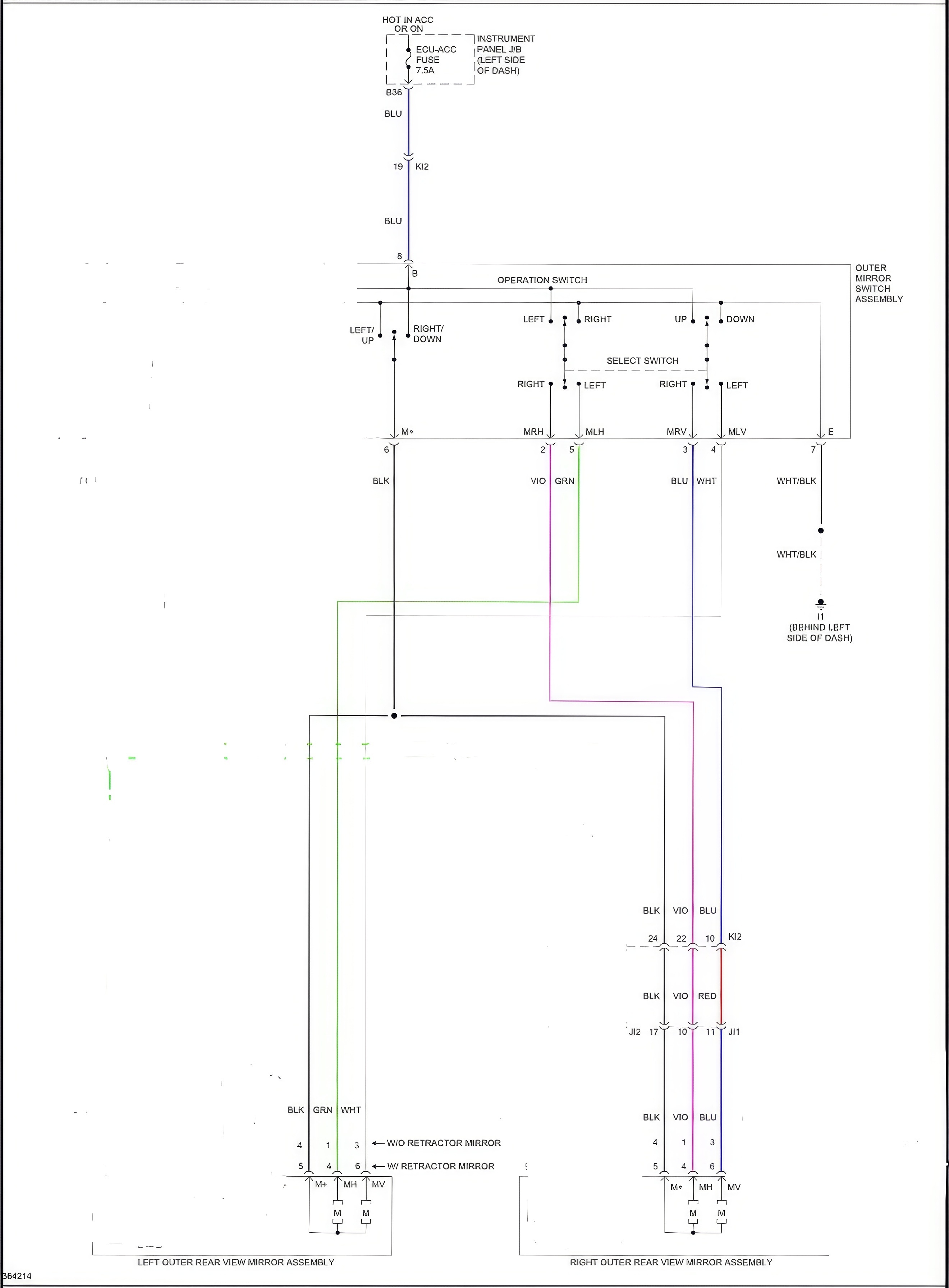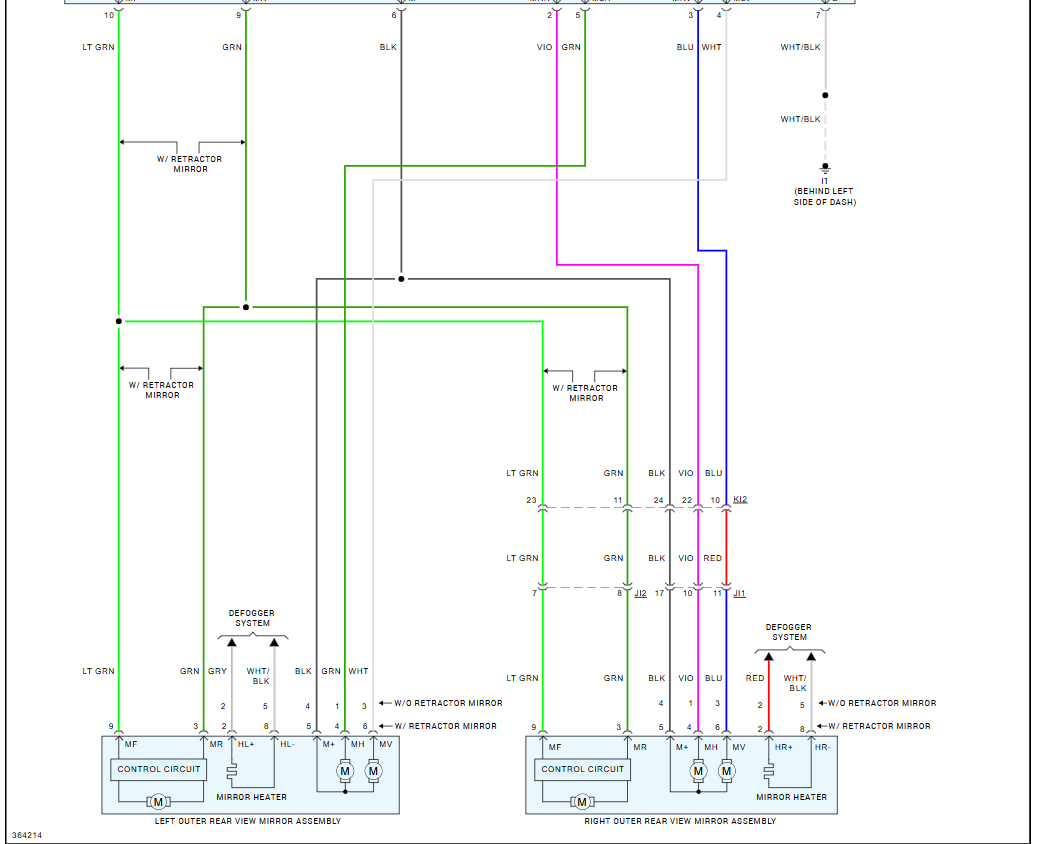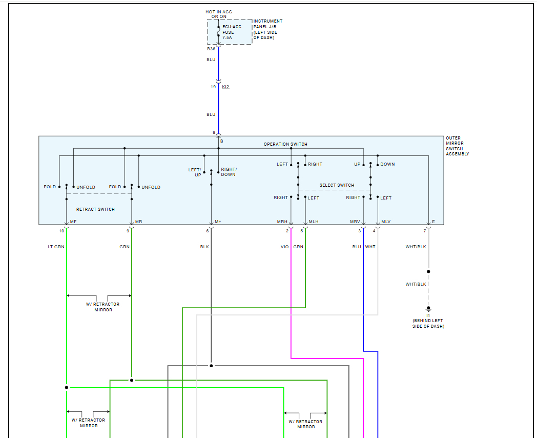 The side mirror has 4 wires and when I look to diagram if ( I omitted the mirror folding and heater wires ) I noticed only 3 wires come from each mirror to switch pins, I understand that 3 wires for (2 for motor direction and one common ground) but my question why in diagram nothing about the 4th wire that come from mirror? What is its function? Where it goes?