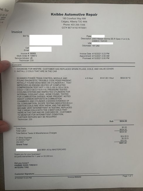Took car into garage for a misfire. Already changed the spark plugs, coils and the valve cover as it was getting oil in the spark plug tubes. I don't understand why they would do a compression test or a coolant pressure test for a misfire. After $691.00, all they did was put in some older coils we still had in the glove box from when we put the new coils in. They wanted $120.00 per coil plus labour to install. I can get coils from NAPA for $75.00 and my son and I can put them in in 15 minutes.