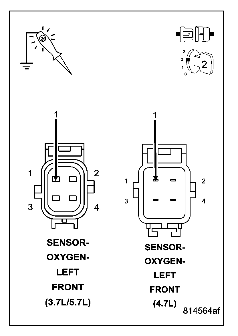 Measure the resistance across the O2 Sensor Heater element between the O2 Heater Control terminal and the O2 Heater ground terminal at the component.
