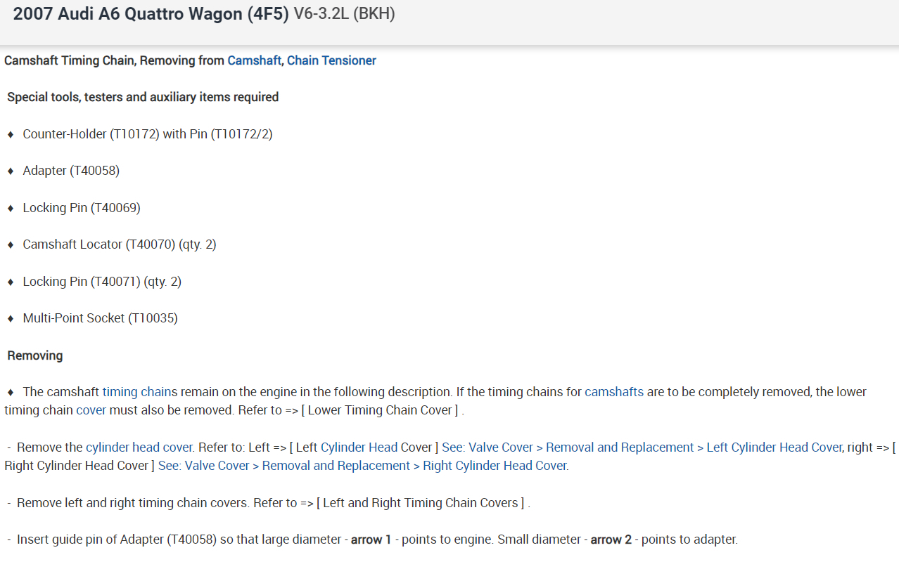 The vehicle listed above is a Quattro. The car had a massive oil leak and a large white cloud of smoke on a cold start. Also had oil in spark plug well on ignition coil. I decided to try and tackle all problems at once. Needed a new coolant pipe (old was cracked), so replaced that along with water pump, thermostat, and oil separator. Now on to the oil leak. Pulled upper cover off, and cam girdle after locking it down with locking too. Resealed girdle and new gasket in spark plug well. Also, a new upper timing chain tensioner while cam girdle was off. Everything went back together smoothly, but now has a heavy vibration on start. Stater also stays on long after car has started. Getting misfires in cylinders 4, 5, 6. Very low idle, and car not moving when stepping on accelerator. CEL is also now on. Guess something, I did wrong with timing. Any help appreciated. Wonder if I should bother with this, or just buy another motor that is used (100,000 miles on it). Local shops have said $3,500 for parts alone to fix timing. Thanks