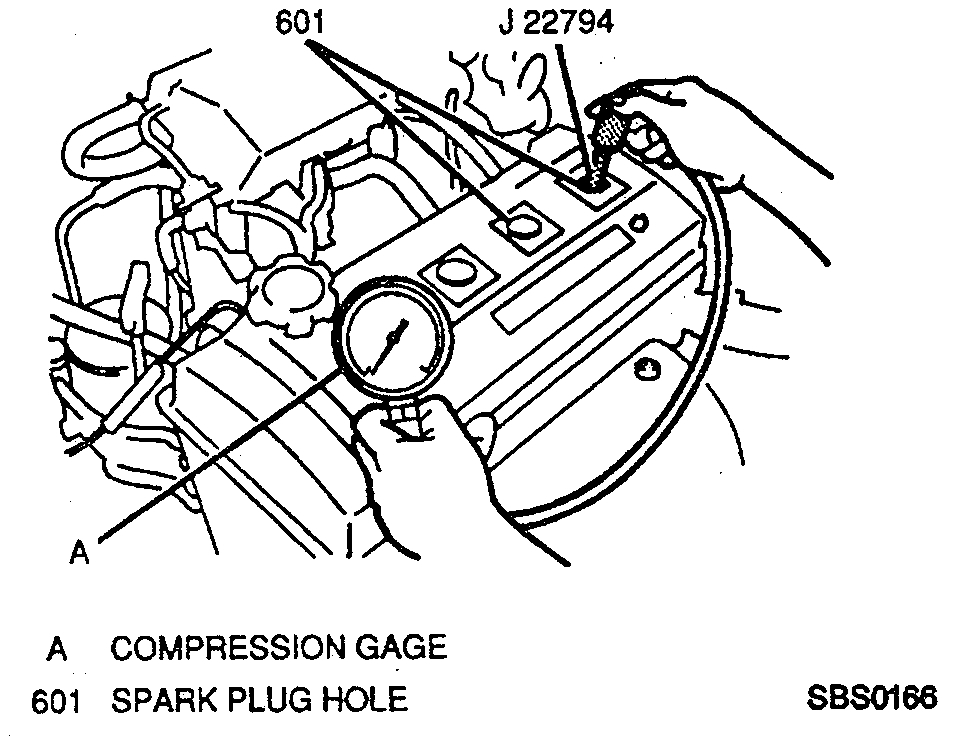 3. Install a J 22794 and a compression gage into a - spark plug hole.