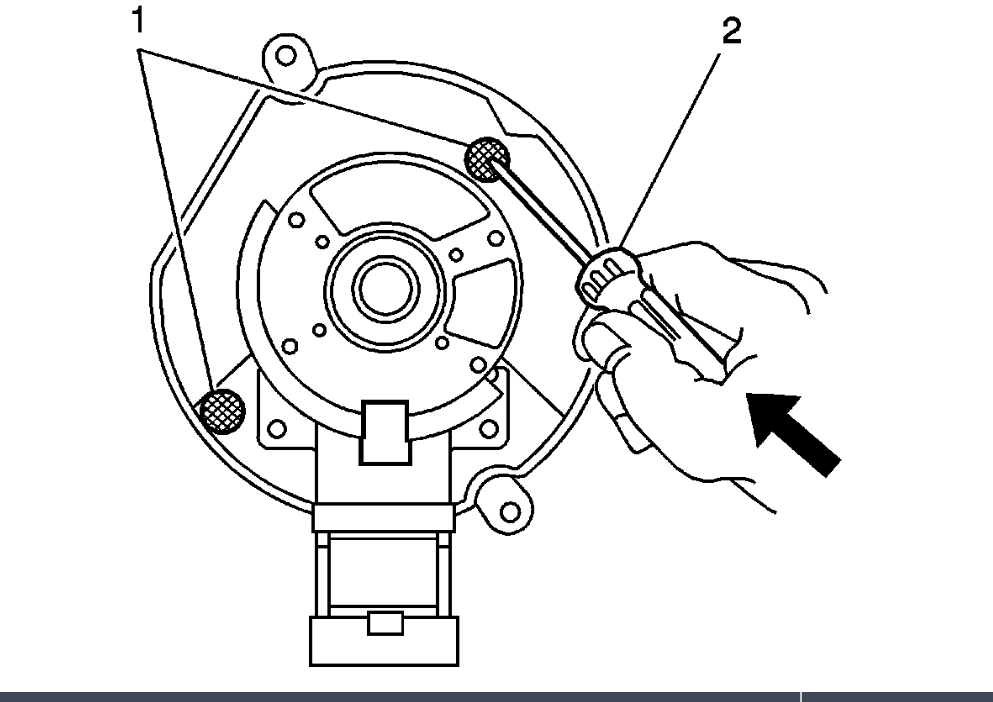 4. Inspect the distributor vent screens (1). If the vent screens are present, remove them by using a plastic-handled, long blade awl or pick (2). Insert into the airflow vent screens and pop them out. Refer to the figure for removal procedure. If the vent screens have been removed from the base of the distributor, then check the airflow inlets for being clogged with debris.