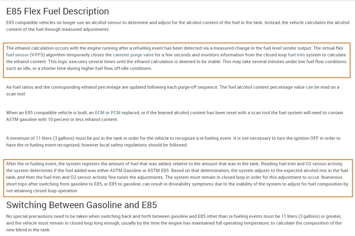 Here's some info on the Flex Fuel systems. I know fuel costs are very high in CA, compared to the rest of the states. Service info here explains that the Alcohol content is calculated through the Evap system and a virtual flex fuel sensor, so there is no alcohol content amount sensor anymore. So, allowing the vehicle to idle for a few minutes after refueling should help the system calculate the alcohol percentage. Another thing that I have seen is water in gas tanks, so if you're refueling at a station you don't normally use, it might be an issue with the storage tanks at that specific gas station. Because service info also states there should be no issue between switching back and forth between gas types as long as there is more than 3 gallons added (bottom of 1st diagram). So, you may have gotten some bad gas somewhere along the way, that's a very difficult diagnosis unless a fuel sample is taken and allowed to sit for a few minutes. The water and gas will separate.