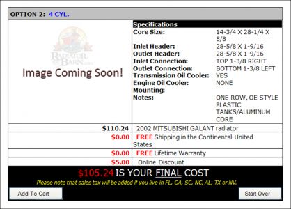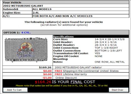 Now I might suggest for the radiator. . .. . ...instead of going with the one from the dealer have your mechanic check out this site. I have attached two for your car. . ..he just has to do some measuring to get the correct one. . ...but they are cheaper.