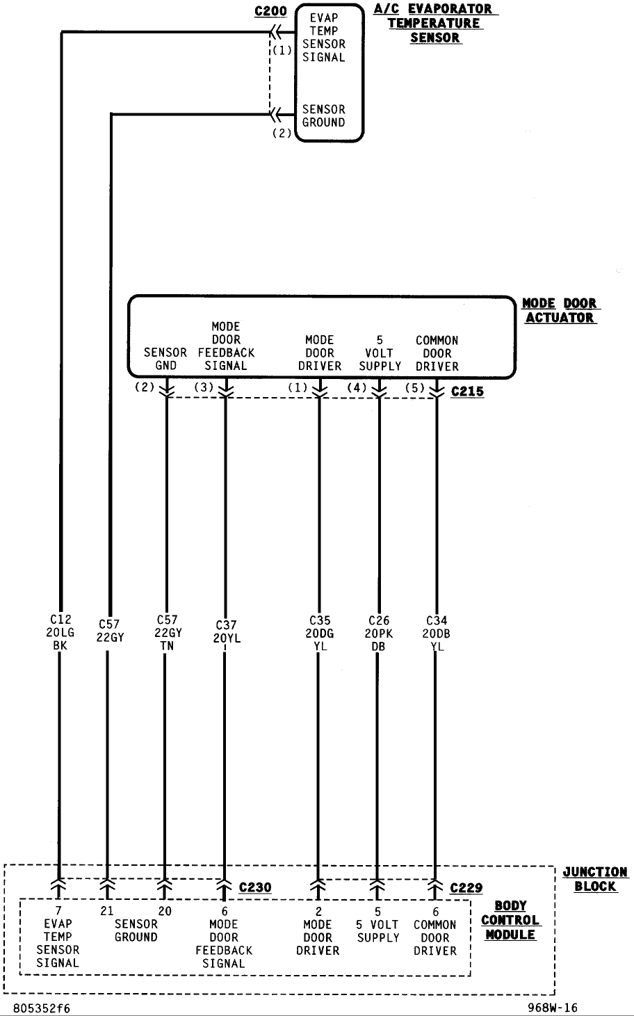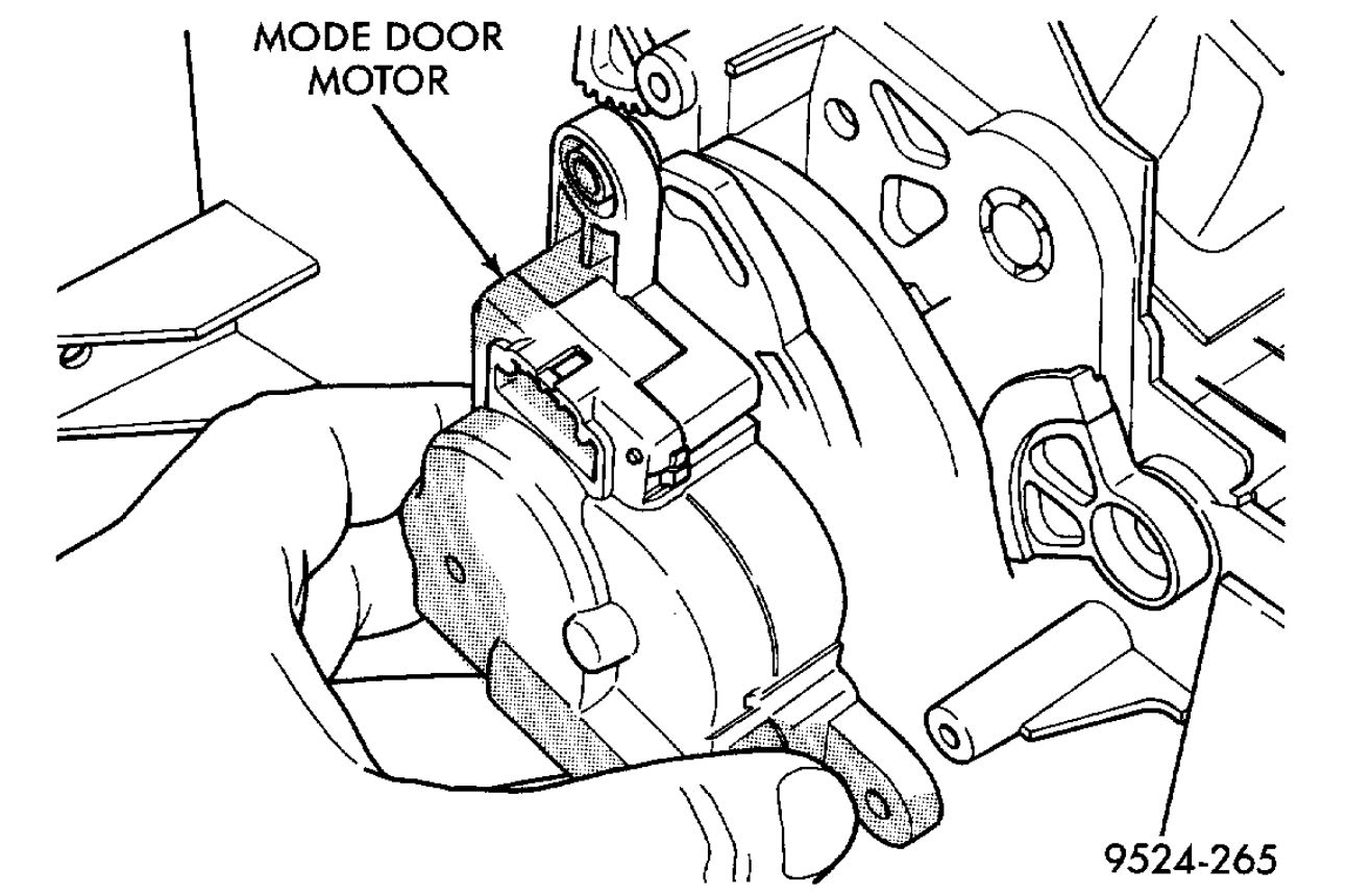 The mode door actuator is an electric motor. It mechanically positions the A/C unit panel/bi-level door and the floor/defrost door. Prior to part replacement, re-calibration of the HVAC actuator is recommended. Calibration is performed by disconnecting the battery negative cable or the removal of the instrument panel M-1 fuse. Electrical power should be re-established after (60) seconds which will automatically initiate the software calibration procedure. If this procedure fails, it will be necessary to replace the mode door actuator/motor. The mode door actuator/motor is not serviceable and must be replaced if found to be defective.