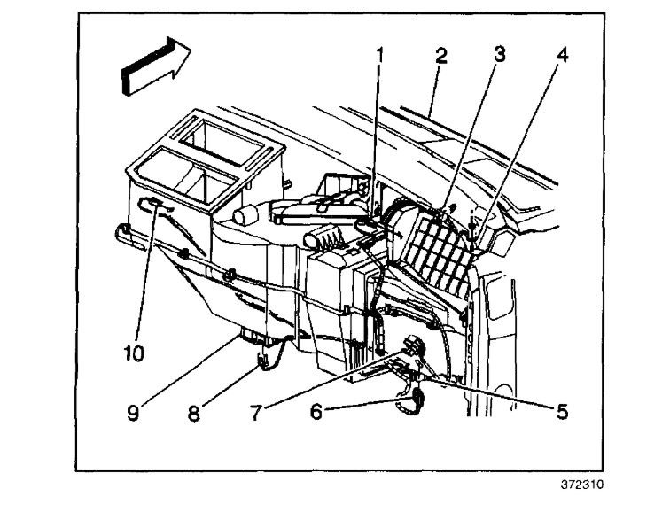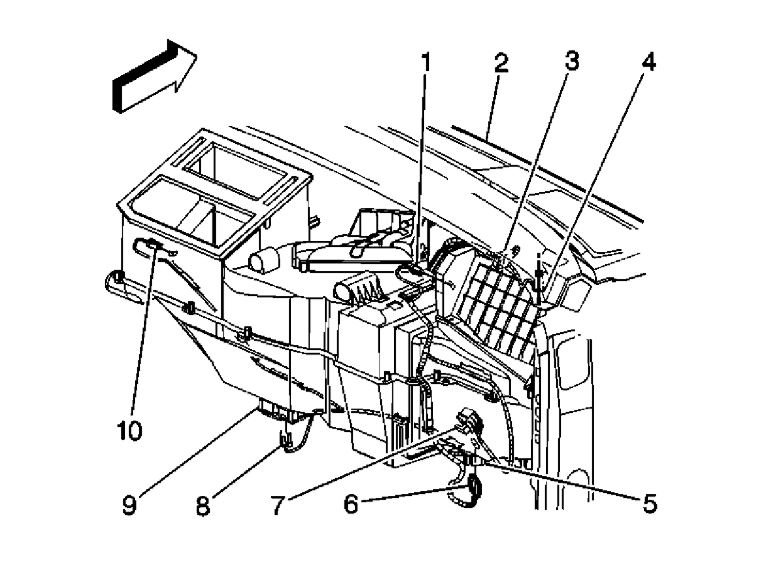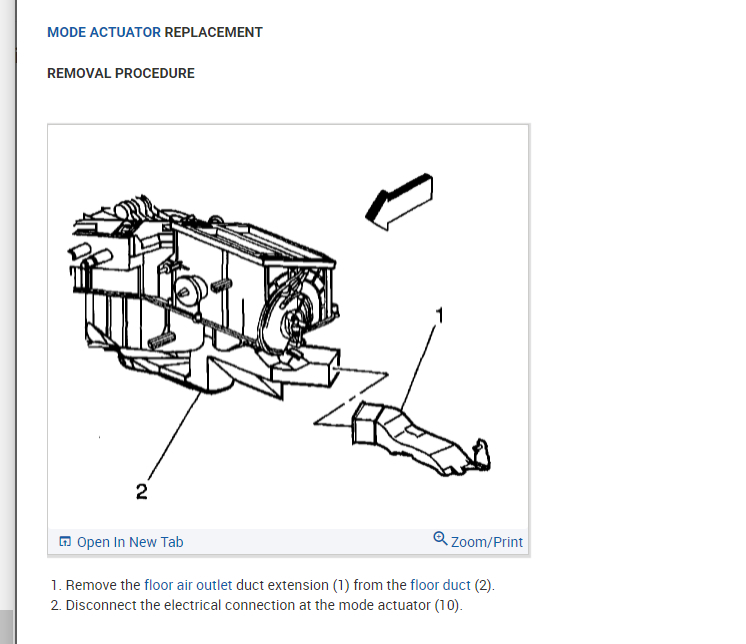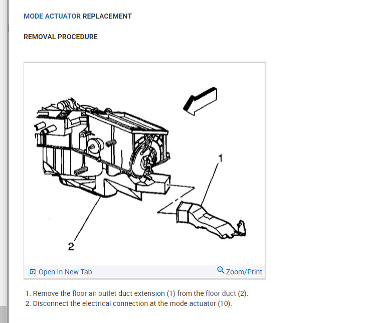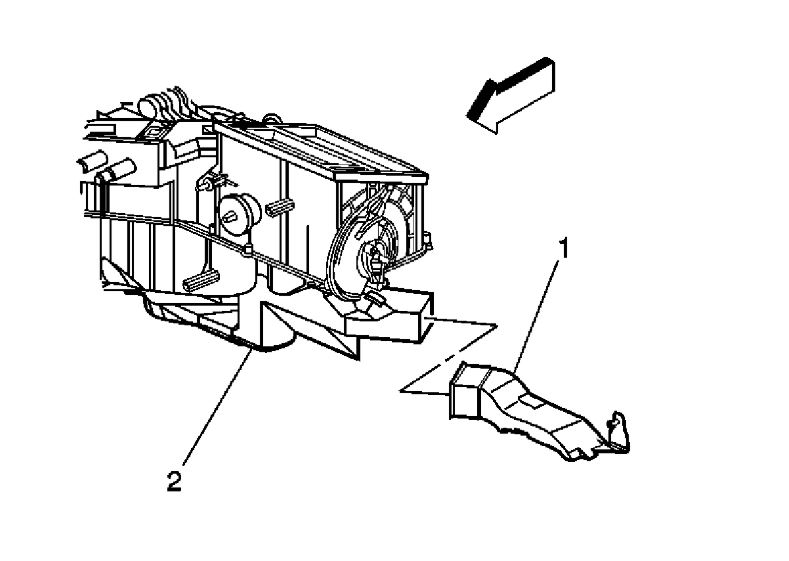 1. Remove the floor air outlet duct extension (1) from the floor duct (2).