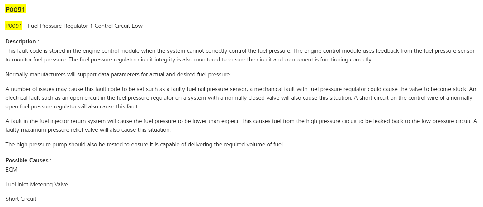 I'm posting some information on the p0091, I know this car has a High Pressure and a low-pressure fuel pump. Which is that reading of 1063psi, which seems low to me, but I cant find a spec for that. But you need special gauges to test the High-Pressure pump.
