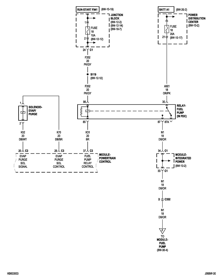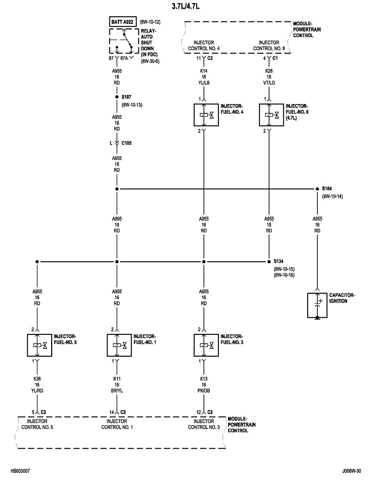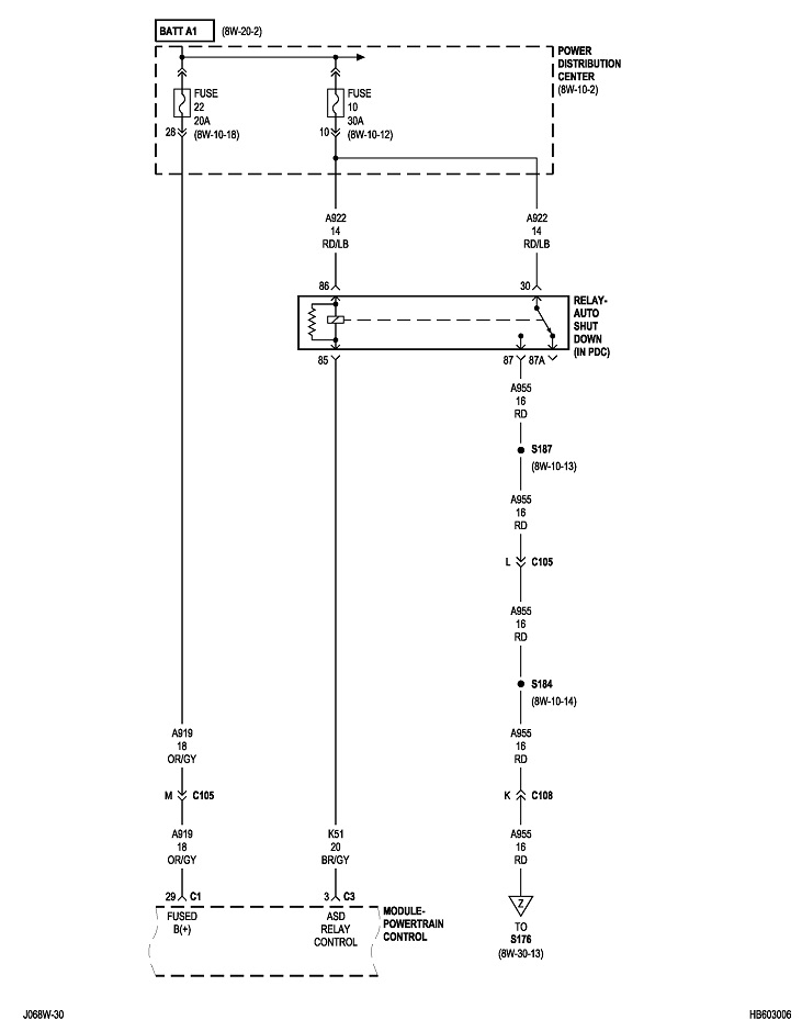You also need to know when the ASD relay turns on. The Engine Computer does that for one second when you turn on the ignition switch, then it gets turned back off until the computer sees engine rotation, (cranking or running). It knows that by the signal pulses it receives from the crankshaft position sensor and the camshaft position sensor. What this means for troubleshooting is you can only do it while cranking the engine. That's not practical.