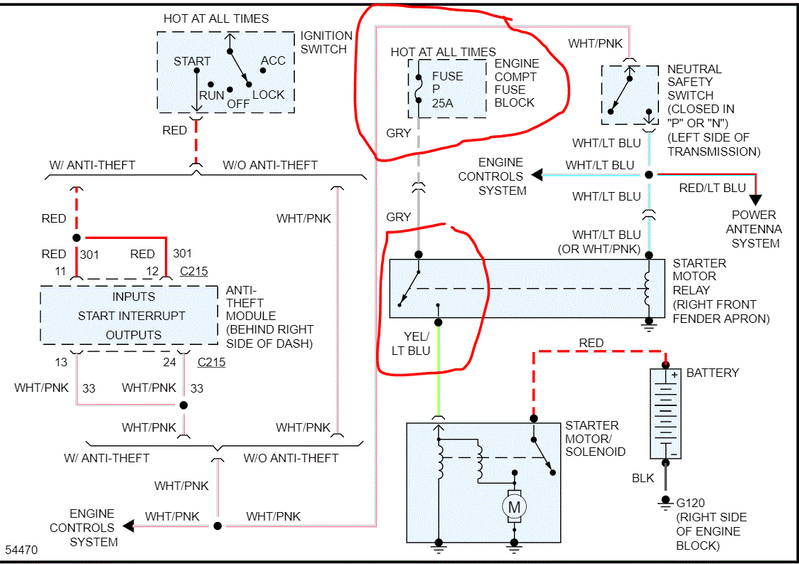Next, the smaller wire on the solenoid which is yellow with a light blue tracer should receive 12v only when the key is in the start position. Have a helper turn the key to start while you check to see if power is there.