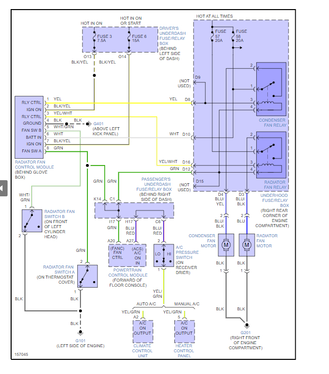 Do the fans come on with the air conditioner? The fans will run when the key is on and then shut off if the engine is not up to operating temperature at which point, they will cycle to maintain the correct temperature. But we should check the system fuses #3 and #6 in the under-dash fuse panel and fuse# 57 and # 58 i the under-hood panel to make sure everything is okay. Here is a guide and the fuse locations in the diagrams below: