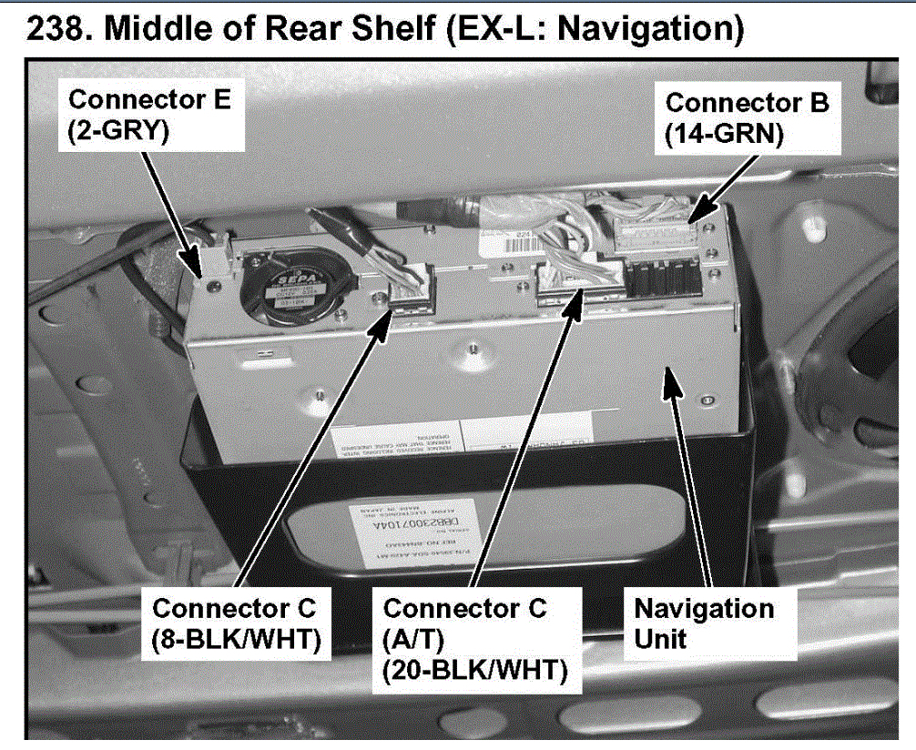 If that is good, open the trunk and locate the navigation module. See pic 2 below. Make sure all connections are tight and connected. Also, make sure there is no evidence of damage to the wiring.