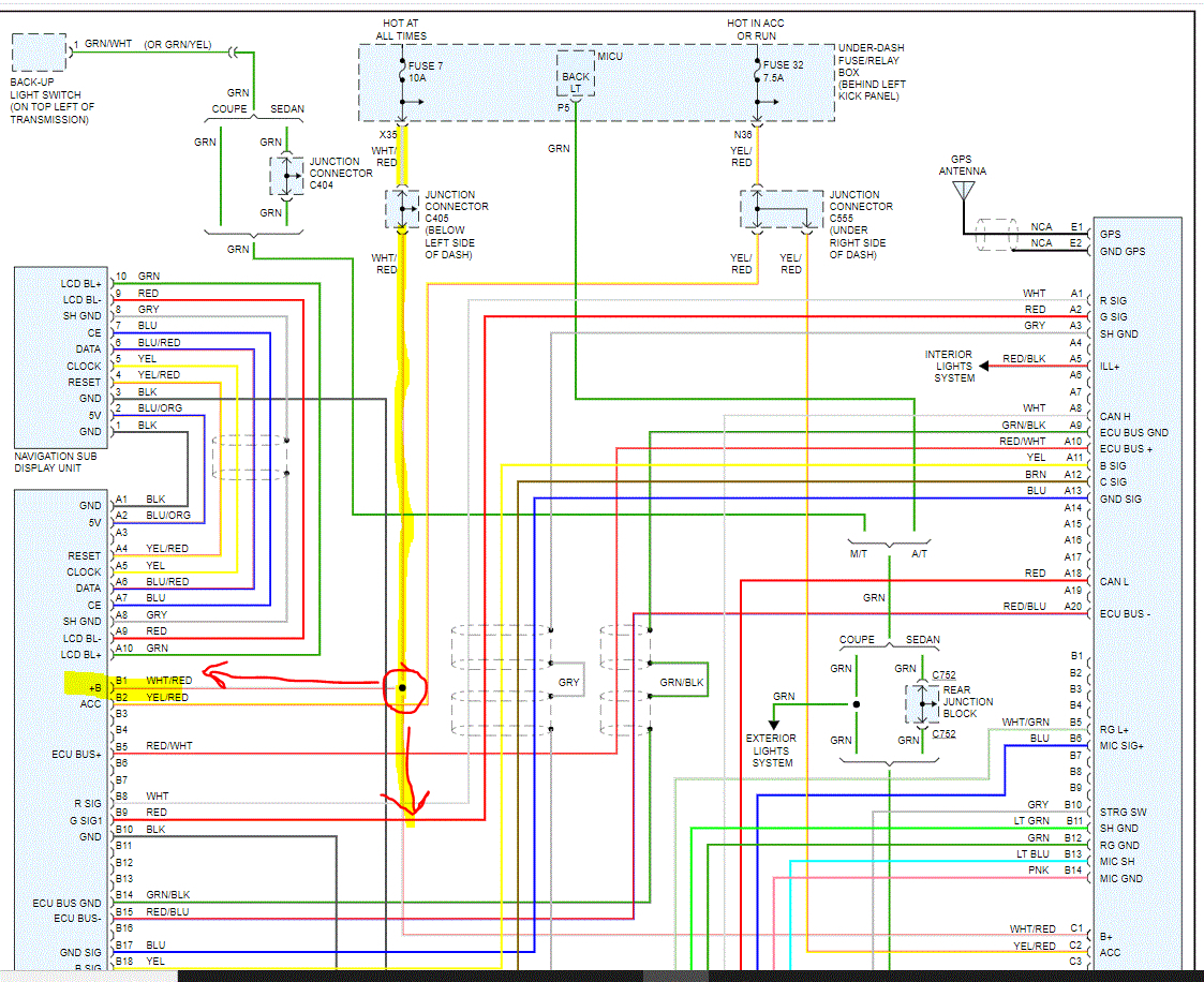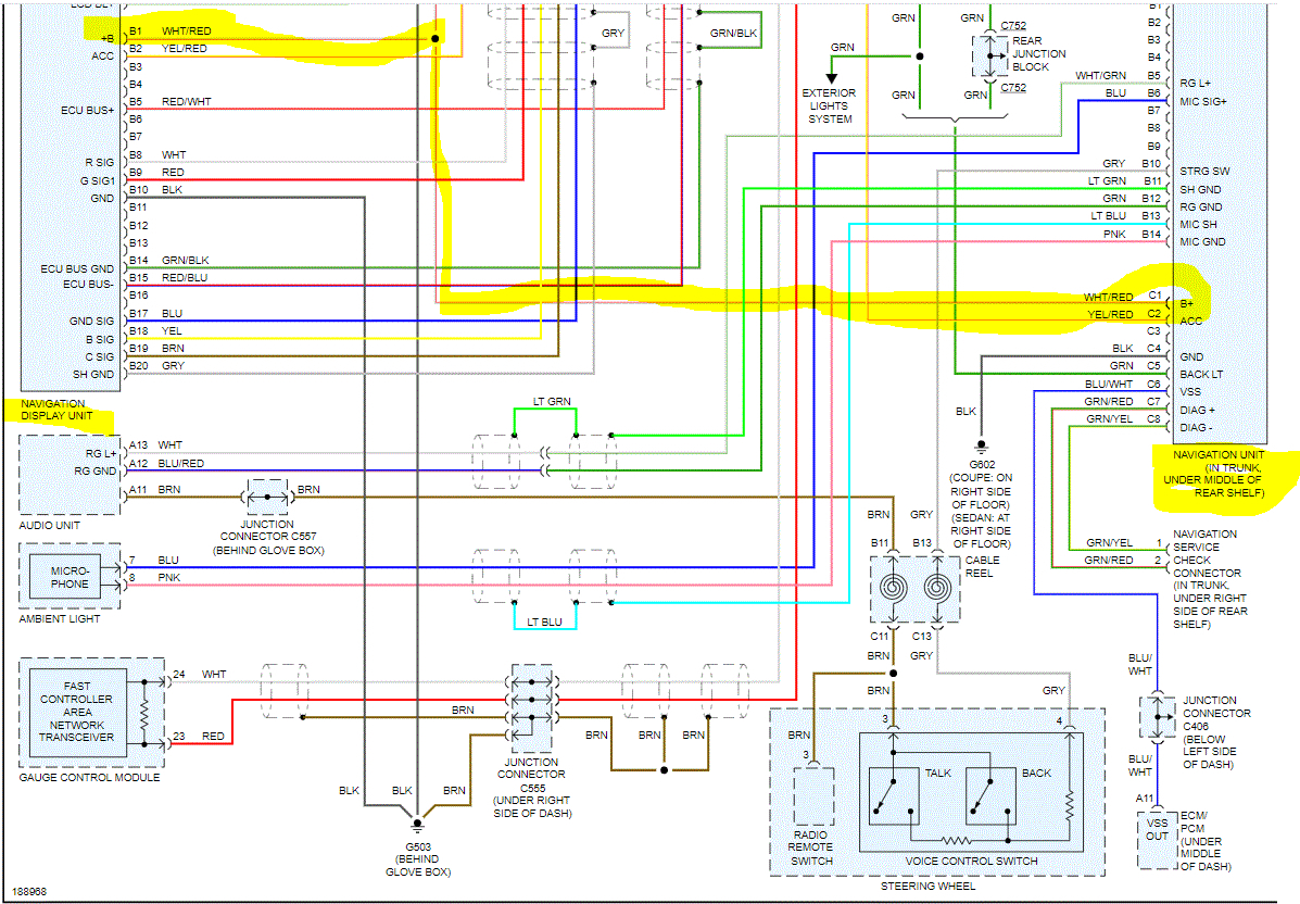 Also, if you look at the last two pics, they are the wiring schematic for the navigation. I had to cut the pic in half to make it readable for you, but I did overlap them so you can follow from one to the next. I highlighted the power supply from fuse one. If you can, check the white wire with a red tracer at the navigation module in the trunk. You will need to disconnect the harness to do this and power should be turned on at the key.