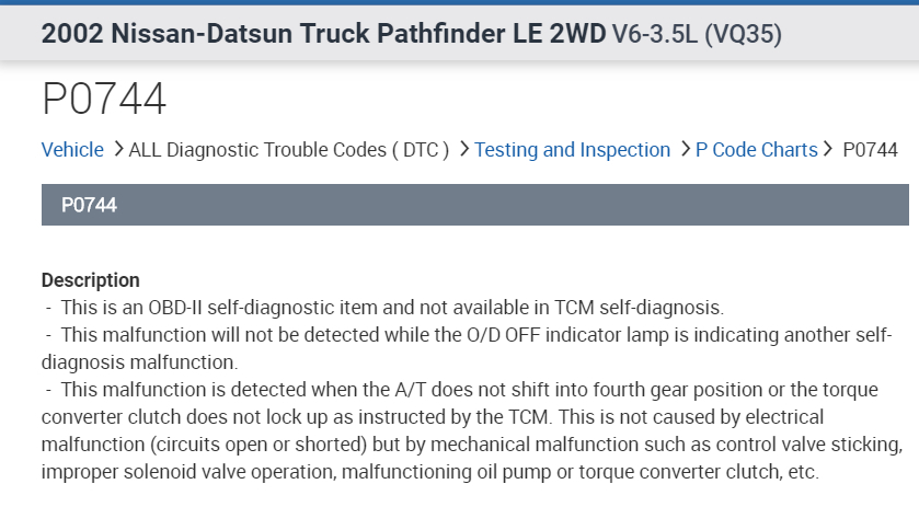 Anyway DTC P0744 is in association with the transmission TCC Solenoid. I have included a description of it in the diagrams down below.