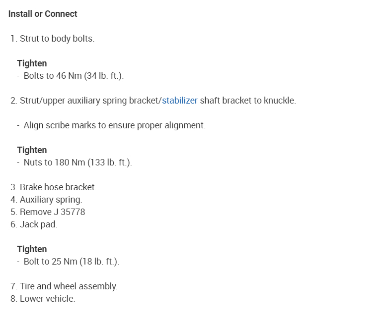 I am replacing the rear struts. I need factory info on how to replace it and what torquing specs I need to tighten the bolts.