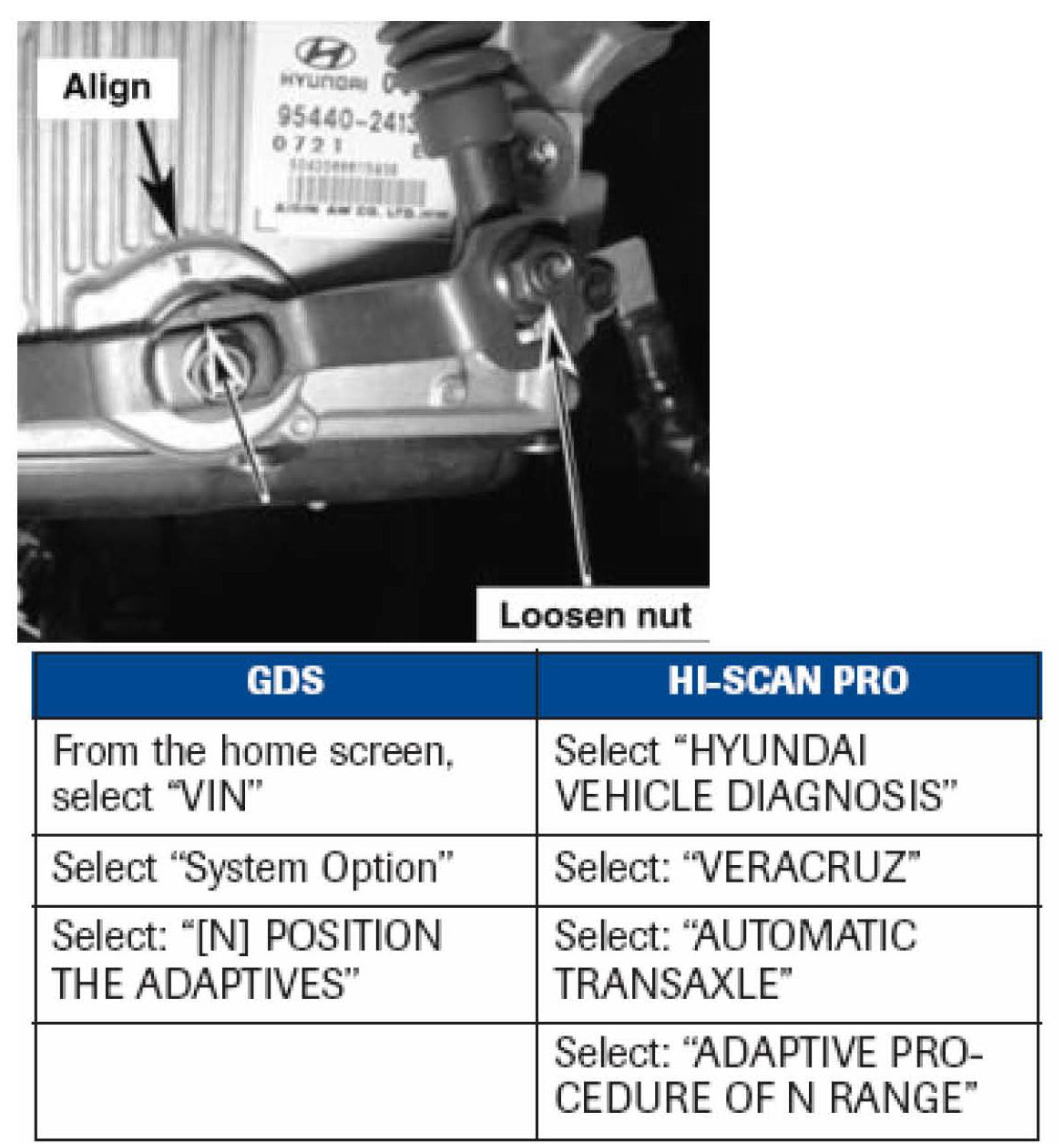 Move the shift lever from "P" to "D" and confirm the shift position indicator on the dash reads correctly. Confirm the correct gear indication using the Hi-Scan or GDS.