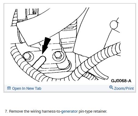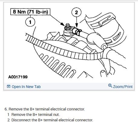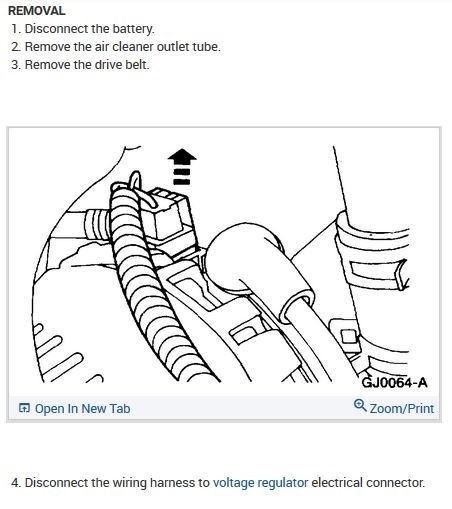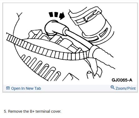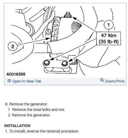 The third way (probably the most accurate way) would be to remove the alternator from the car and take it to the parts shop for testing. They'll mount it to a machine and run it to see exactly what it puts out. This rules out the possibility of a major short circuit or a blown fuse if the alternator is the problem. I'm attaching AllData's information on how to remove the alternator in the images below. It's fairly straightforward and should just require some basic mechanic's tools (wrench set, ratchet and socket set, and a screwdriver or two).
