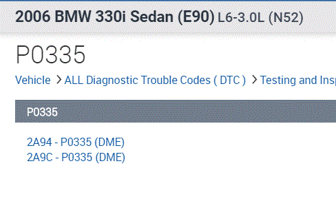 Vehicle ALL Diagnostic Trouble Codes ( DTC ) Testing and Inspection Manufacturer Code Charts Digital Motor Electronics 2A9C 2A9C - P0335 (DME)