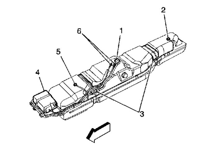 17. Remove the fuel sender assembly and the fuel pipes (6) from the fuel tank and the fuel filter.