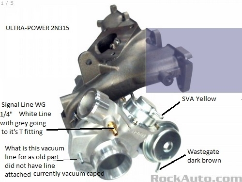 I am positive the vacuum line connections are correct, and the Ultra-Power Turbocharger is a match for the original part. That being said I am attaching multiple pictures of the old turbo, the new turbo installed showing Vacuum lines connected. I may have a gasket leak which is causing the whistling sounds, but the whistling sounds increase when the fourth vacuum port is left open, and I have power loss. The original turbo also has a fourth vacuum port as shown in pictures and it was left open.