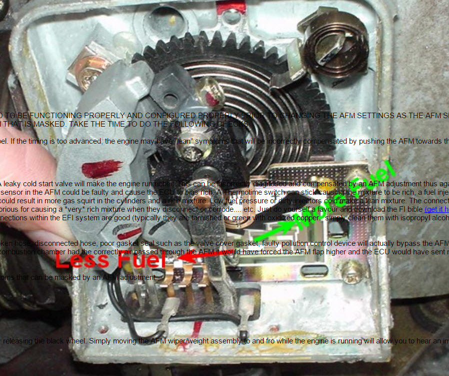 The Black Wheel and Coil Spring is the mechanism that controls how far the flap opens when air flows through the throttle body. This is the heart of the AFM and if the spring is set incorrectly, the related voltage to the ECU will be wrong and it will send too much or too little fuel. If the spring is wound too tight, the AFM's flap will not move enough and the ECU will not send enough fuel thus a lean mixture will occur. If the spring is wound too loose, the AFM's flap will move too much and the ECU will send too much fuel thus a rich mixture will occur.
