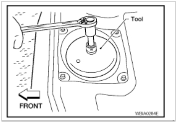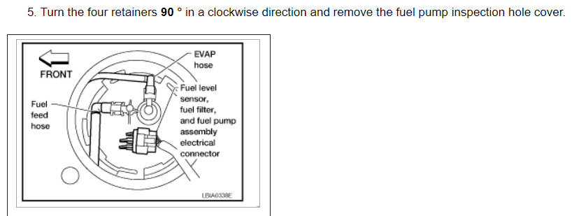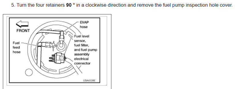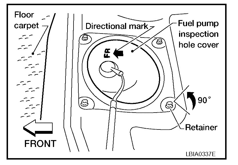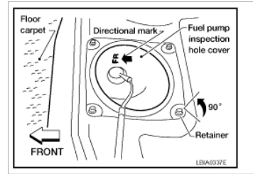 5. Turn the four retainers 90 degrees in a clockwise direction and remove the fuel pump inspection hole cover.
