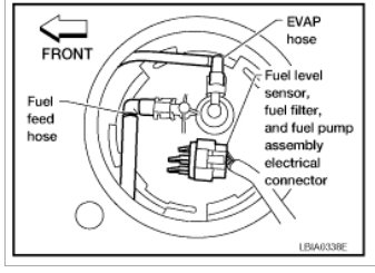 6. Disconnect the fuel level sensor, fuel filter, and fuel pump assembly electrical connector, EVAP hose quick connector, and the fuel feed hose quick connector from the fuel level sensor unit, fuel filter, and fuel pump assembly.