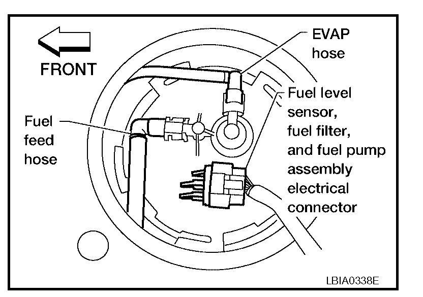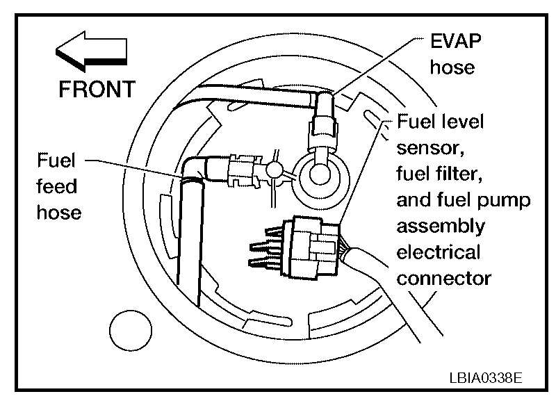 Install the fuel level sensor, fuel filter, and fuel pump assembly with the fuel feed hose facing the front of the vehicle as shown.