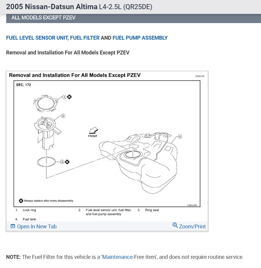 NOTE: The Fuel Filter for this vehicle is a "Maintenance Free Item", and does not require routine service.