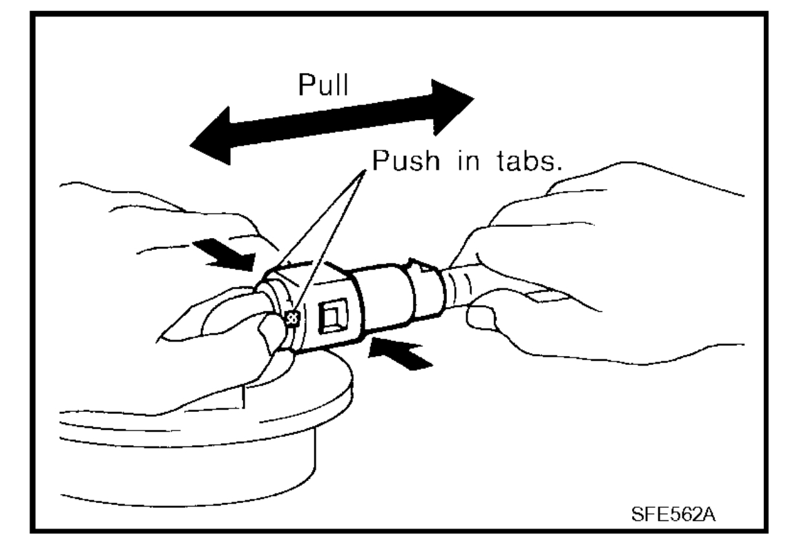 - Hold the sides of the connector, push in tabs and pull out the tube.