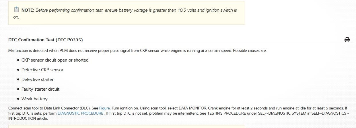 As far as what the codes mean, they both are pointing to problems with the crankshaft position sensor or its circuit. I am attaching ProDemand's information concerning the P0335 code in the images below. The P1320 code specifically says to solve the P0335 code first, so we will deal with that later if needed. Also, I understand that you do not necessarily have all of tools needed, so do what you can for now.