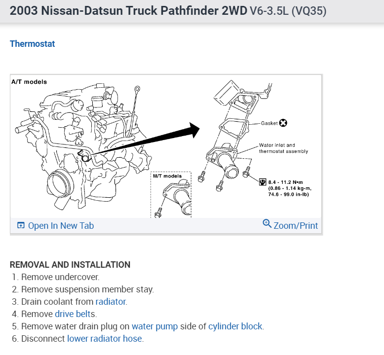 I own a 2003 nissan pathfinder se, 6 cyl. Please tell me where the thermostat and housing are located and how difficult it is to replace?
