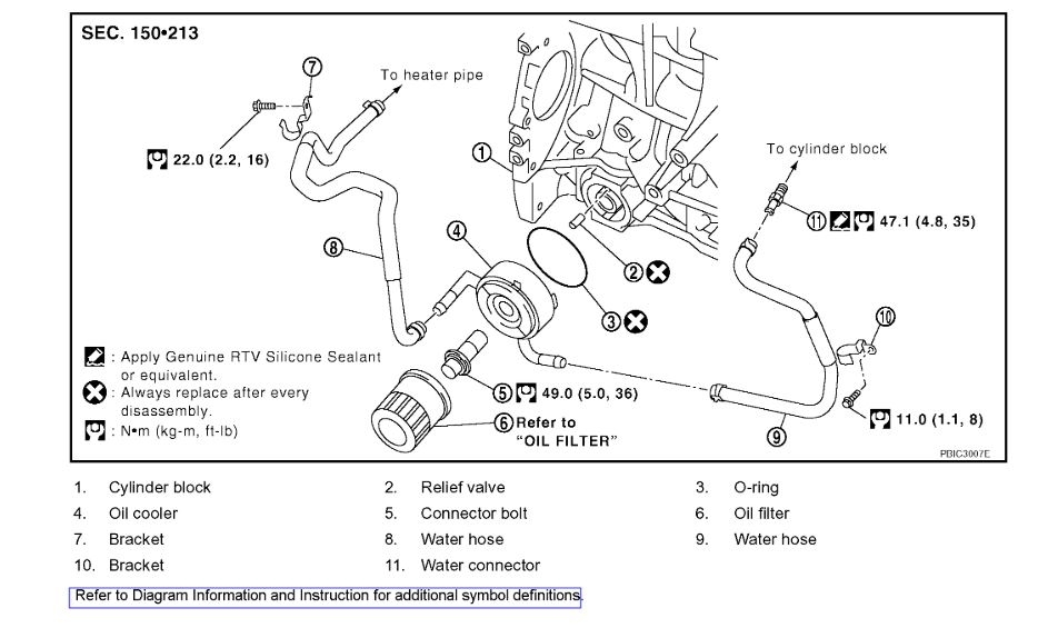 When removing oil cooler only, pinching water hoses near oil cooler to prevent engine coolant spilling.
