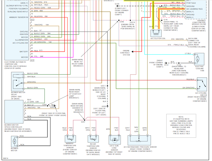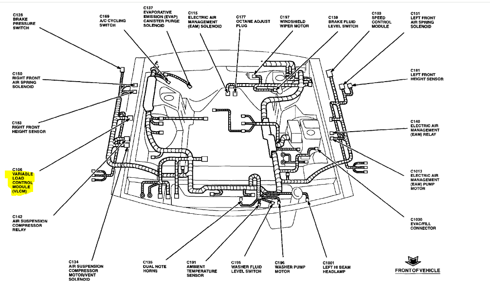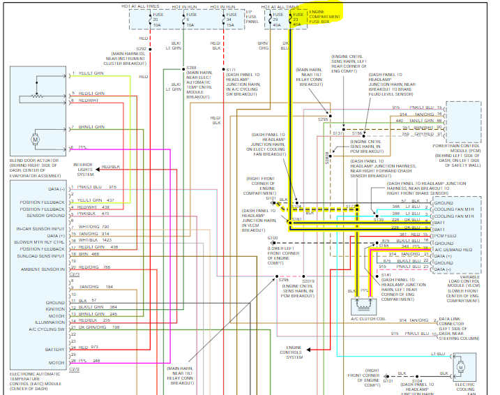 Last issue - A/C will not turn on including with control set to max A/C. Clutch never engages. There is 35-40PSI in the system low side at 70 degrees ambient temperature. Self-test on control head passed, no fault codes. I cannot access the clutch coil connector from above or below without moving a bunch of A/C plumbing. So cannot energize directly to test. Compressor turns just fine by hand with engine off. I also have an OBDII+ Bluetooth scanner which shows A/C press switch at around 0.25V. States of clutch, cycling sw, med pressure sw, and driver request all show 0 when Max AC selected. Hypothesis: mechanics ok. Prob is in the control system. Cannot locate VLCM which controls clutch if I wanted to try energizing clutch from there. I must be blind. Wiring diagram shows VLCM in "front lower center of engine compartment" as last stop before clutch energizing on purple wire. What do you suggest for the next step? Thx.