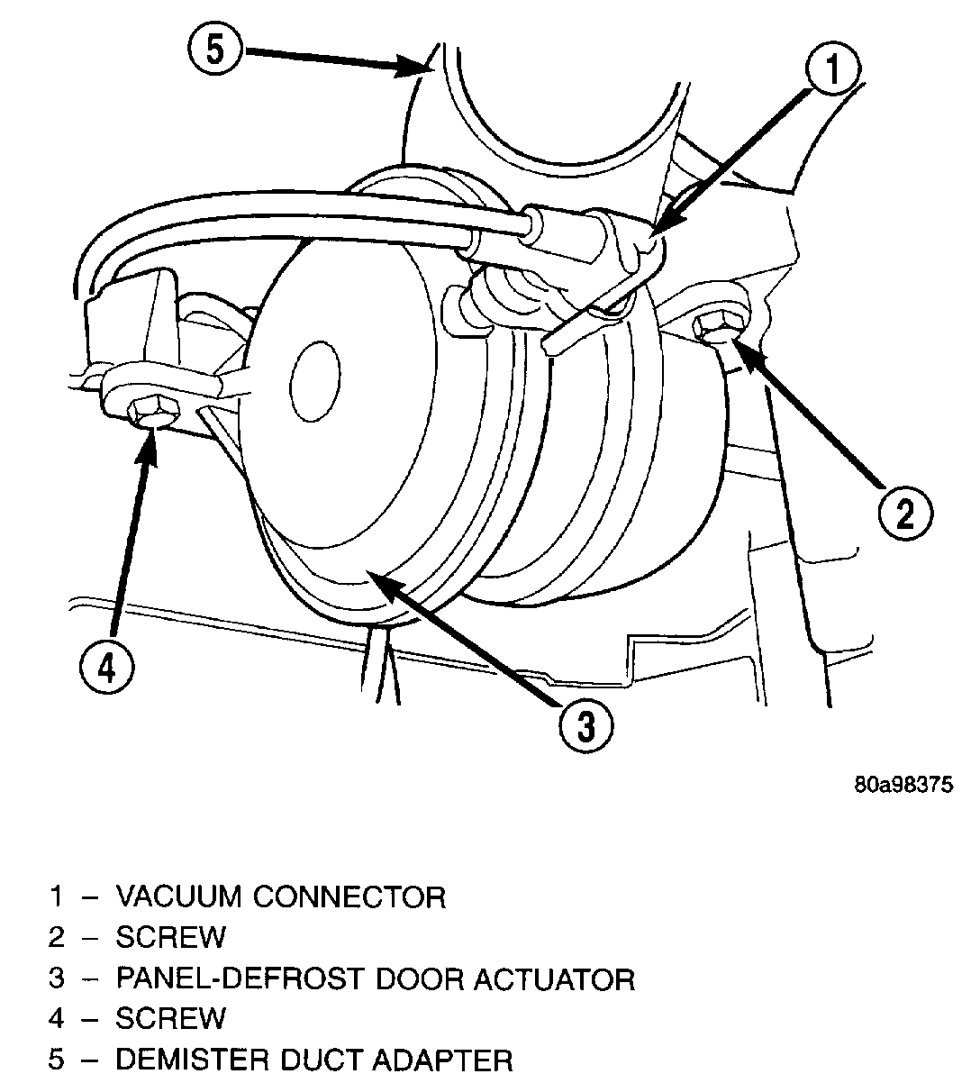 4. Remove the two screws that secure the panel-defrost door actuator to the heater-A/C housing.