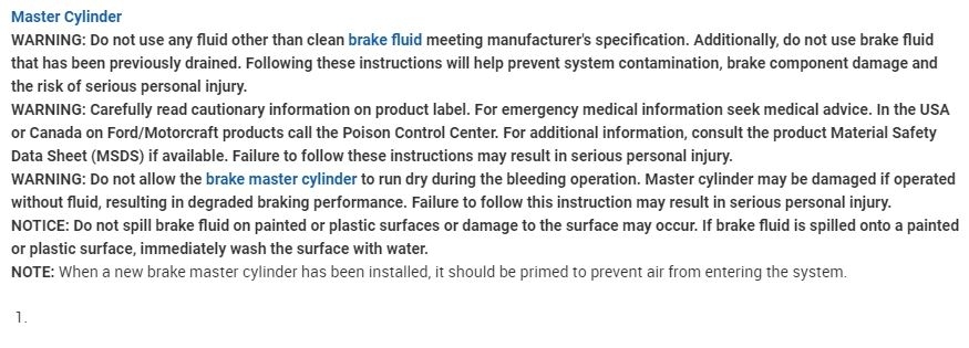 WARNING: Do not use any fluid other than clean brake fluid meeting manufacturer's specification. Additionally, do not use brake fluid that has been previously drained. Following these instructions will help prevent system contamination, brake component damage and the risk of serious personal injury.