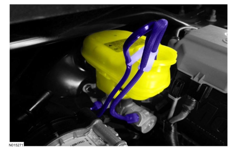 NOTICE: Do not spill brake fluid on painted or plastic surfaces or damage to the surface may occur. If brake fluid is spilled onto a painted or plastic surface, immediately wash the surface with water.
