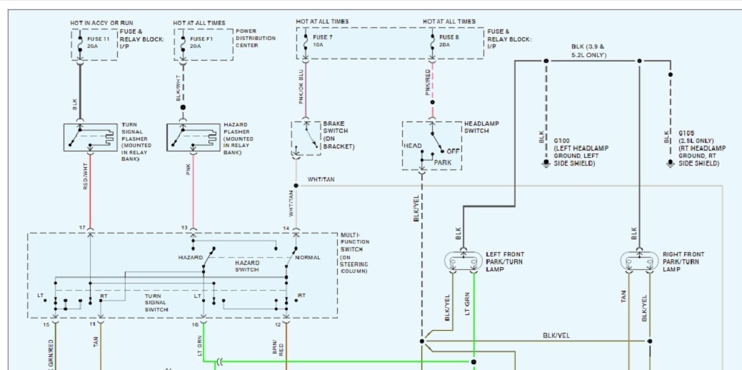 Also note 12 volts for the signals comes in on a different circuit from fuse # 11, then through the flasher, and to the signal switch on terminal # 17. Being on a different circuit, this is why the signals might work while the brake lights don't, or the other way around
