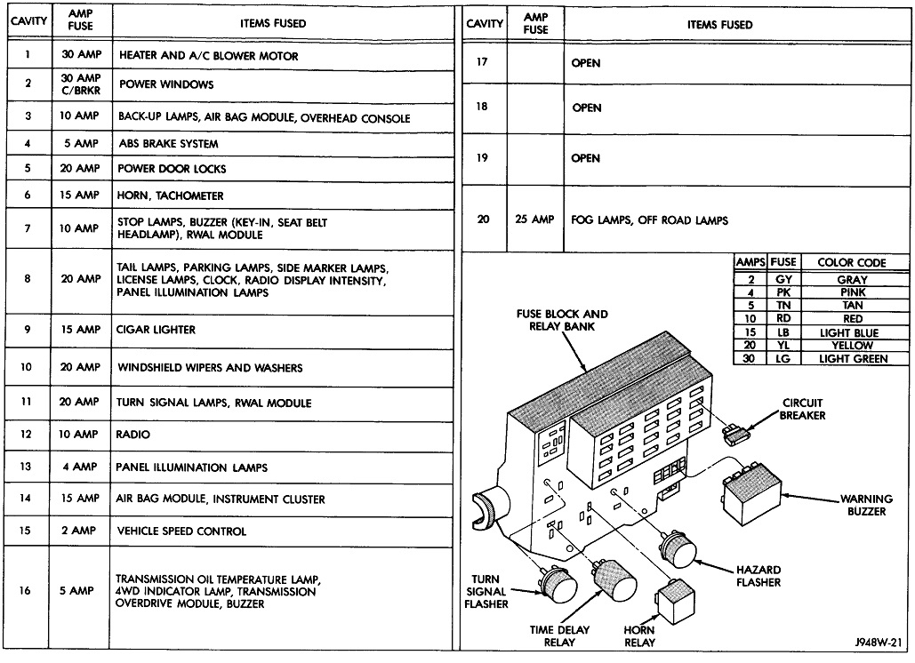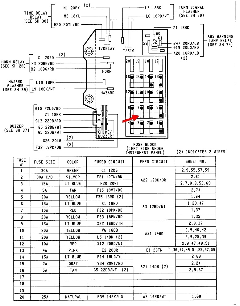 Getting back to your brake lights, to catch anyone else up, these first two drawings are for the Power Distribution Center, (PDC / under-hood fuse box). The next two are for the Junction Box, (inside fuse box). I added a red arrow pointing to fuse # 7 that powers the brake lights. Note fuse # 7 also runs the key-in buzzer, so if that buzzer works, you know the fuse is okay.