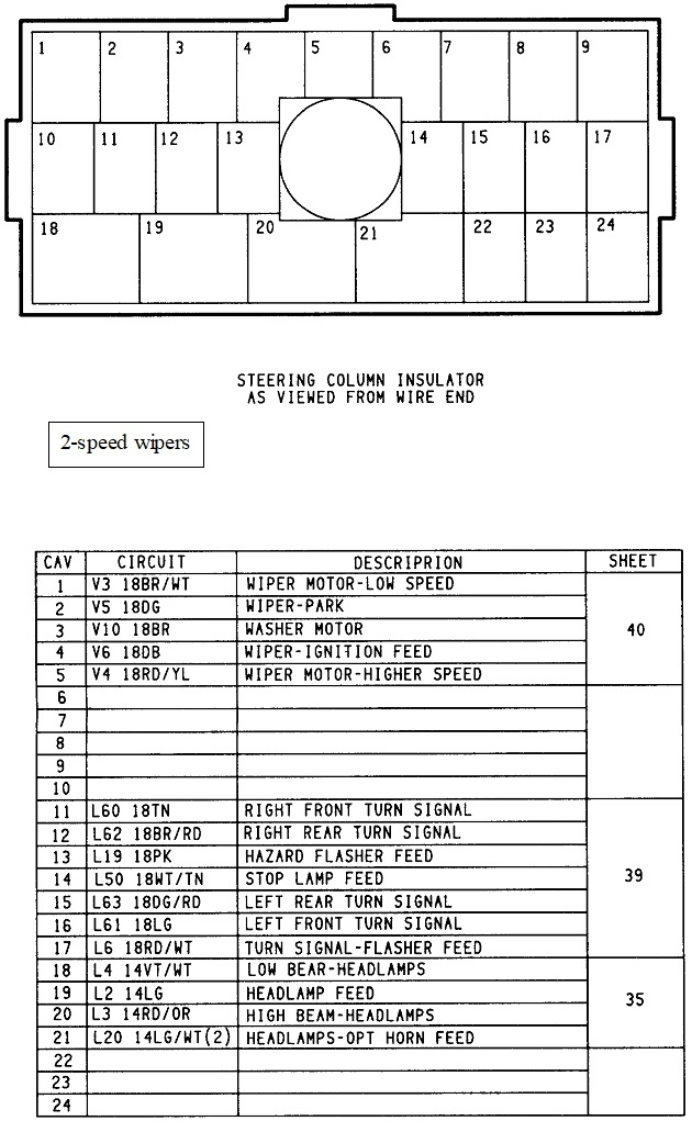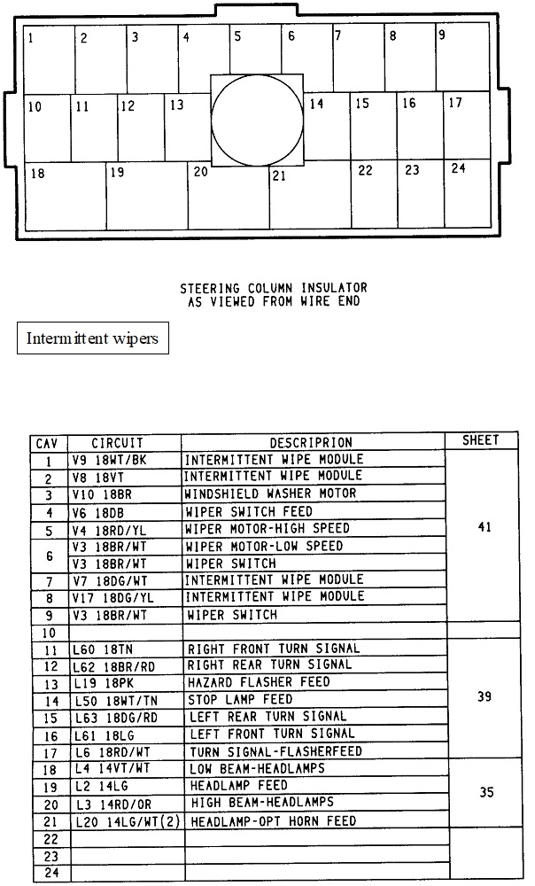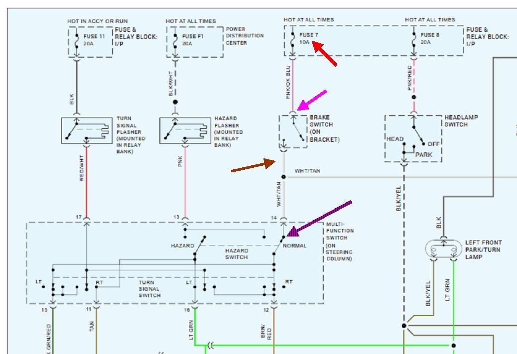 To continue on, the next step is to check for 12 volts on that white / tan wire at the multifunction switch connector. This switch design is a real lot easier to remove than the older style, but there's still some work involved. We can skip ahead in hopes the switch is okay, then back-track if necessary. The common problem with this switch is the right half of hazard switch where the white / tan wire comes in on terminal # 14 When that part develops an arced or pitted contact, current to the brake lights can't get through. A potential clue is if you hold the brake pedal down, the brake lights might flicker when "irritating" the hazard switch. That switch can also become deformed inside and short intermittently, blowing fuse # 7.