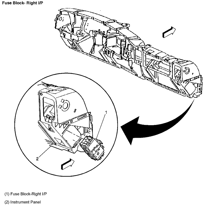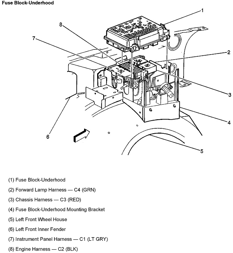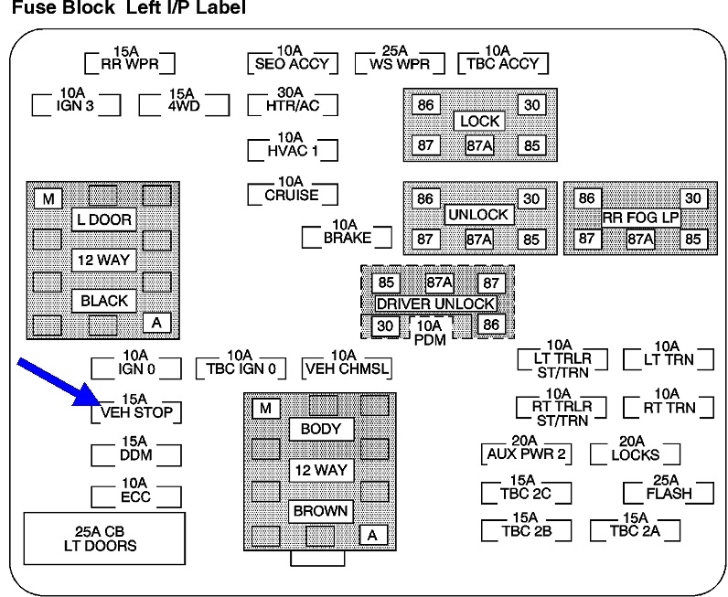 In this case we know there's 12 volts getting all the way past the brake light switch because the center high-mount brake light turns on. Everything up to the red arrow has to be working. Next, look for the blue 15-amp "Veh Stop" fuse in the inside fuse box. That's on the left side of the dash. There will be two tiny holes on top for test points. Check for 12 volts on both of them while the brake pedal is pressed.