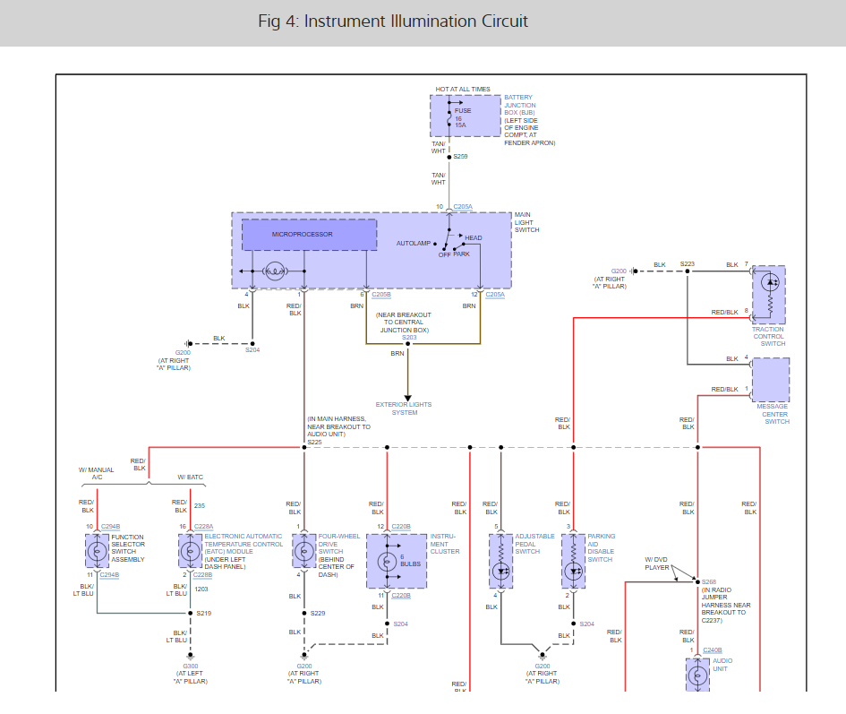 Here is the exterior lighting and cluster bulb wiring diagrams so you can see how the system works. If #16 does not have power, you could have a fuse panel that has gone bad, and you may need to supply an alternative power provider. Check out the images (below). Let us know what happens and please upload pictures or videos of the problem.