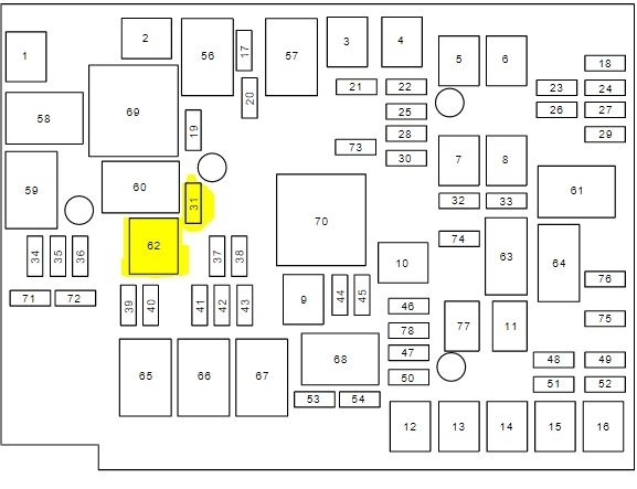 Lets start with the AC compressor fuse (#31) and the relay (#62). Both are located under the hood in the power distribution box. I have attached a pic of the fuse box and highlighted both the fuse and the relay. If you can find another relay with the same part number, switch the two and see if that makes a difference, but check the fuse first.