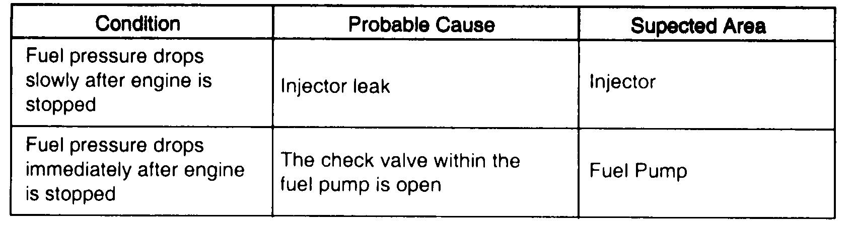 Observing the declination of the fuel pressure when the gage reading drops and perform the necessary repairs using the table below.